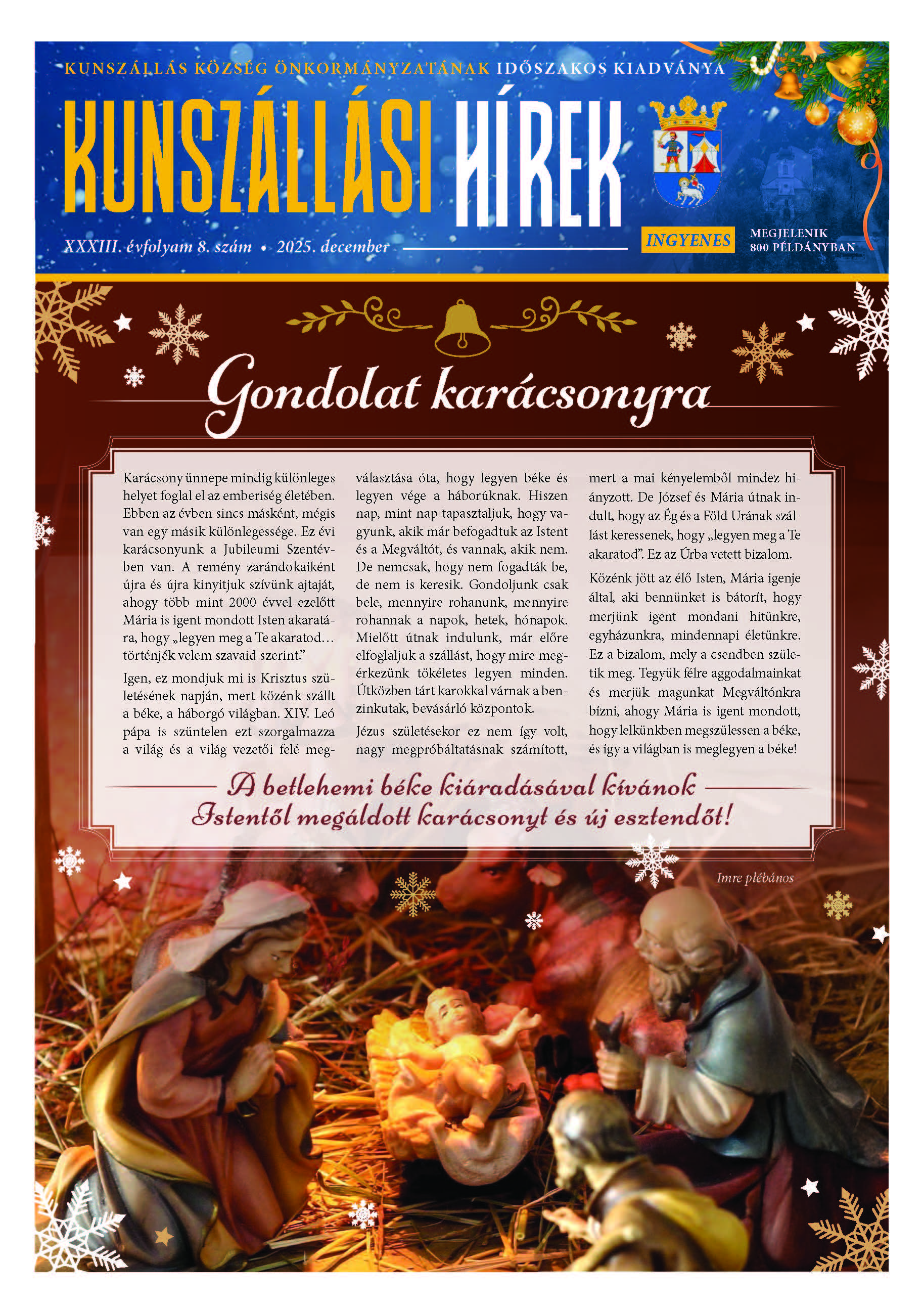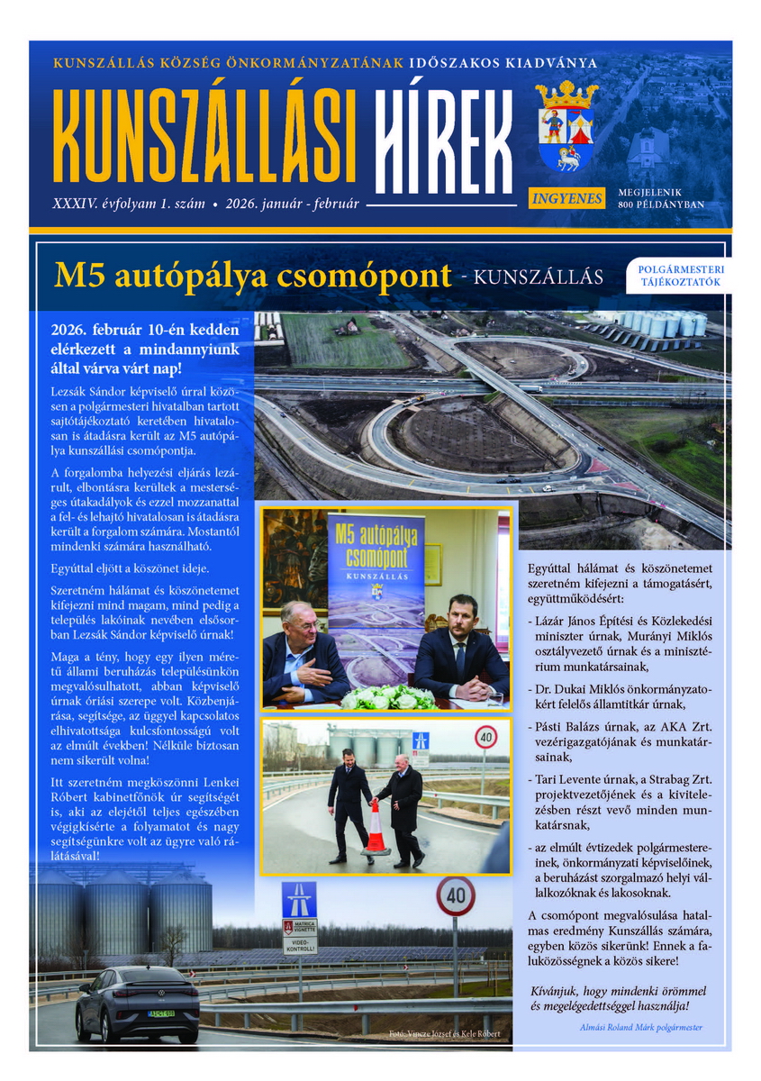 Nagy örömünkre szolgál, hogy egyre több helyi fiatal dönt úgy, hogy szülőfalujában marad és alapít családot, ugyanakkor a környékről és az ország legkülönbözőbb pontjairól is szívesen választják fiatal párok, családok Kunszállást leendő otthonuknak. Ennek a folyamatnak támogatásaként számos beruházás valósulhatott meg az elmúlt években és továbbiakat tervezünk az előttünk álló időszakban. Nap, mint nap azért dolgozunk, hogy Kunszállás még élhetőbb, színesebb és családcentrikusabb település legyen. Célunk a honlap megújításával, hogy segítséget nyújtsunk az itt élők mindennapi ügyintézéséhez, ezért a felületen folyamatosan megtalálható lesz minden fontosabb tudnivaló és friss információ.