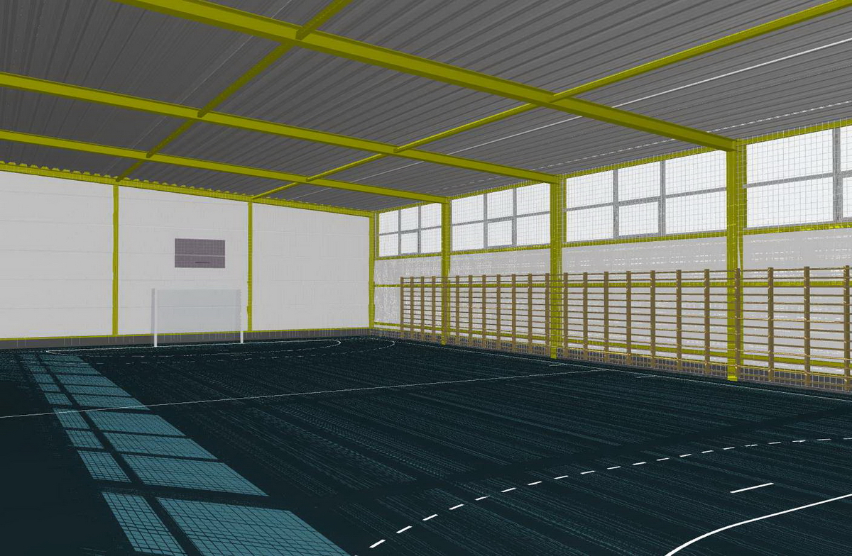 Az épület teljes alapterülete több mint 600 m2, melyből a tornacsarnok 15x30 m, azaz 450 m2, mely a szabványos kézilabda pálya mérete. A kiszolgáló épületrész pedig 160 m2, melyben előtér akadálymentes mosdóval, férfi és női öltöző saját vizesblokkokkal, orvosi szoba, szertár, gépészeti helyiség és külön takarítószeres raktár épül. Az épület magassága az optimális használhatóság érdekében 5,5 méter.