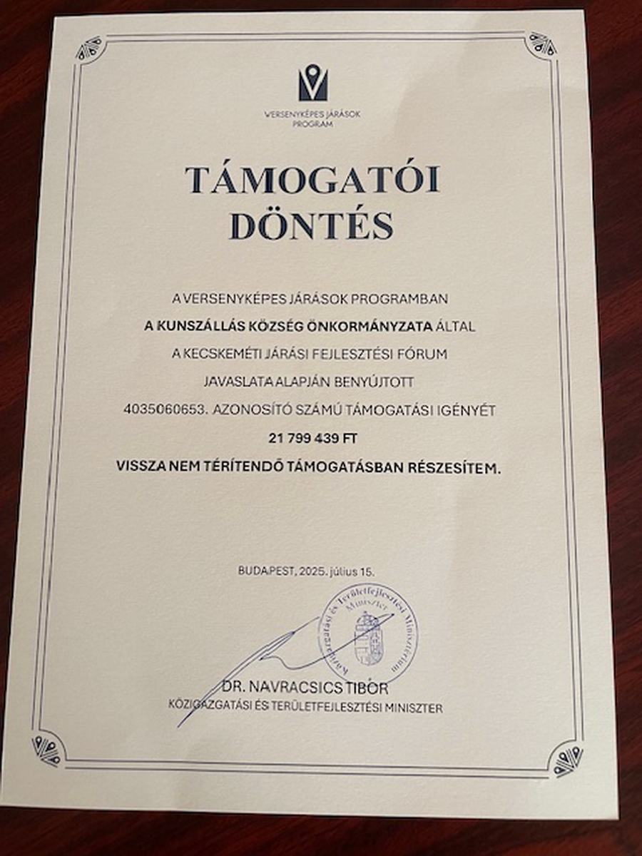 Örömmel jelenthetjük be, hogy a Versenyképes Járások Programnak köszönhetően újabb sikeres pályázattal gyarapodtunk. Kecskeméten, 2026. február 10-én megrendezésre került Önkormányzati Fórum keretében Dr. Dukai Miklós önkormányzatokért felelős államtitkár úrtól vehettem át a 16,25 millió forint támogatásról szóló döntést. Ebből az összegből a Hunyadi utca felújítása fog megvalósulni, a Kossuth utca és a Rózsa utca közötti szakaszon.